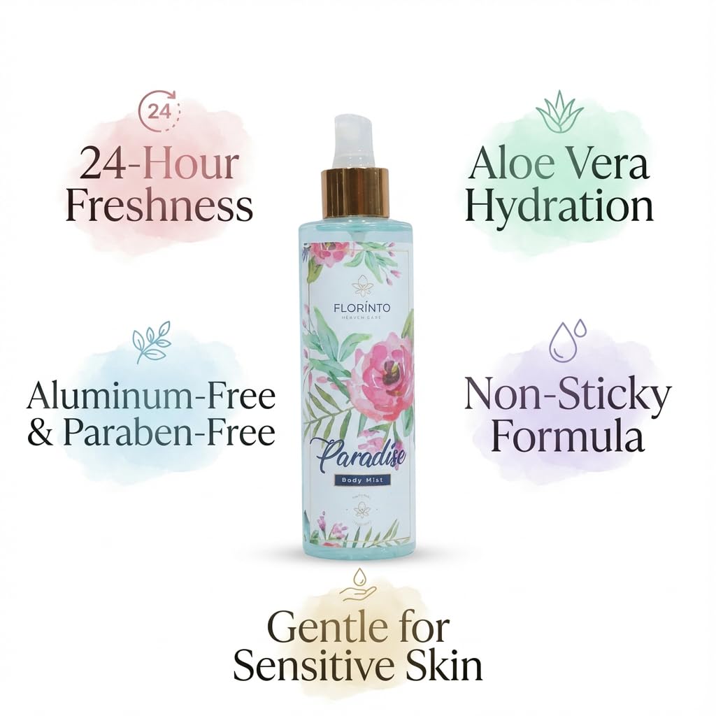 FLORÍNTO Body Mist – 24-Hour Freshness with Aloe Vera Gel – Hydrating, Aluminum-Free & Paraben-Free Spray for Sensitive Skin – Soothing, Non-Sticky & Gentle Formula – 200 ml (Riveno)